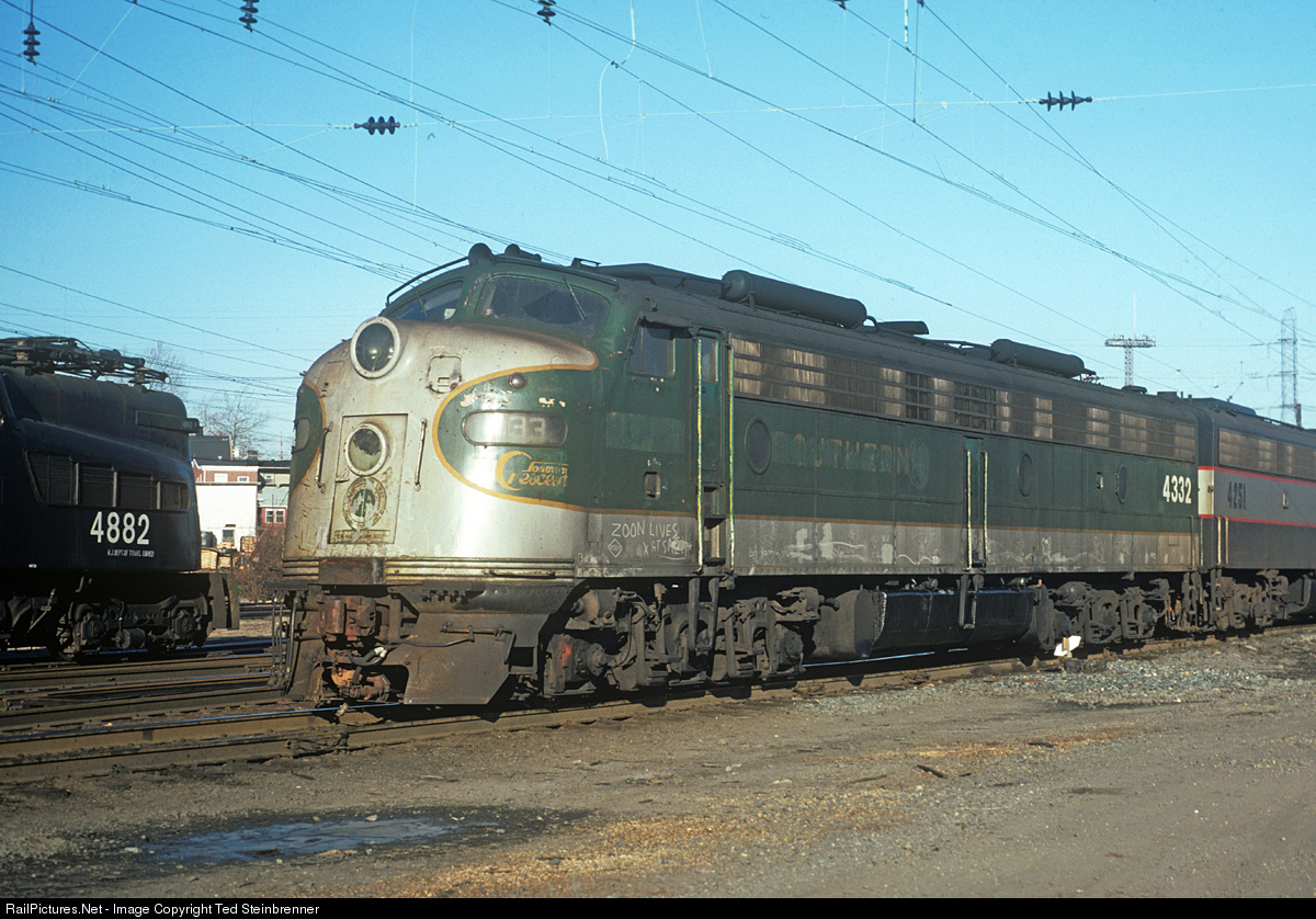 Engine Change. We are in South Amboy, New Jersey in 1982, but these locomotives could very well have made a similar hand-off of the Southern Crescent in Washington, DC in years past. After the Southern ceased operating the Southern Crescent on February 1st, 1979, NJ Transit acquired some of their E8s. Other than the number change, it is difficult to tell that #4332 is no longer employed by the Southern. #4332 trailed E8 #4251 on a NYC bound train and GG1 #4882 will be taking over.
