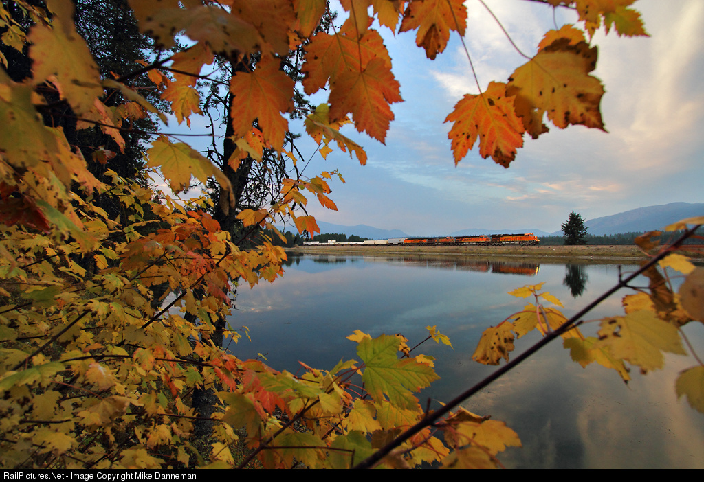 Surrounded by the colors of autumn during a pastel sunset, an eastbound BNSF Z train rumbles over the causeway along Frog Pond west of Trout Creek, Montana, on October 2, 2015. A new ET44C4 leads the detouring Z train on Montana Rail Link’s Fourth Subdivision.