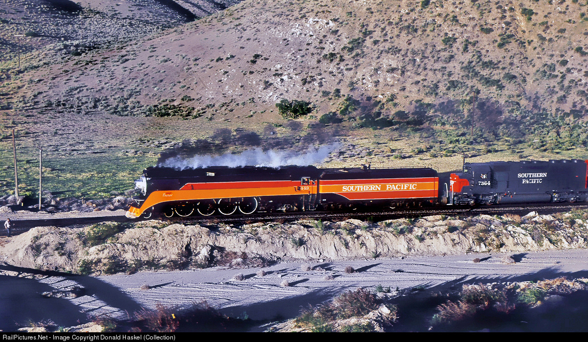 Daylight at sunrise. SP 4449, and its short train, had departed Bakersfield, CA and led a predawn chase over the narrow roads below Tehachapi, before encountering full sun east of Monolith. This Lima 4-8-4 is among the favorite steam engines for Southern Pacific and west coast fan trips.