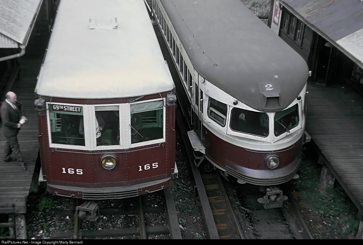 Car 165 was a Brill built Strafford Car and 202 was Brill Bullet. 165 was on a fan trip and 202 was a regularly scheduled car. A Roger Puta photograph