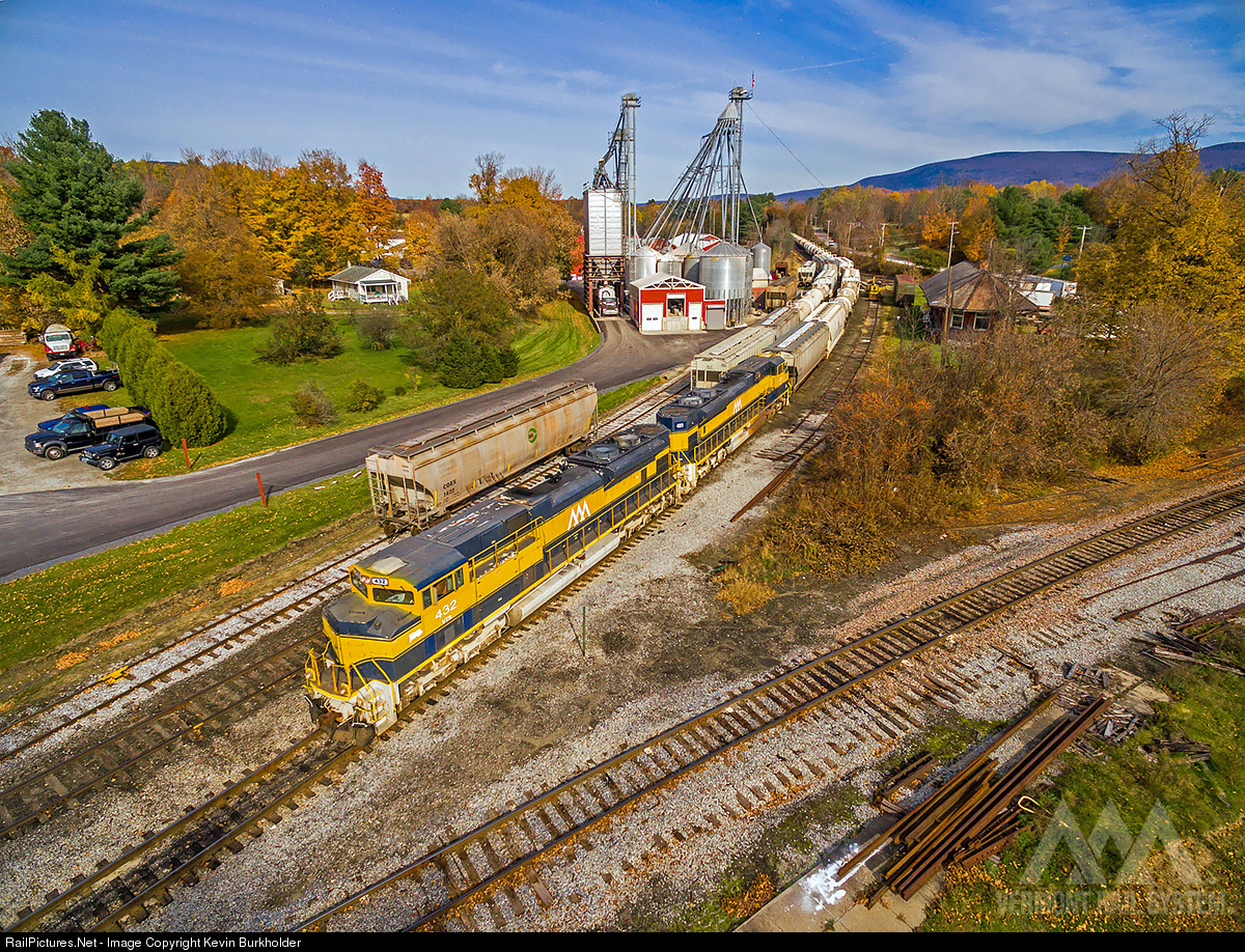 | The ex-Florida East Coast Railway SD70M-2s 101/103 turned Vermont Railway 431/432 are seen rolling into North Bennington, Vermont, on October 27, 2015. The units are slated to be painted during the next few months and wear the attractive 51-year-old Vermont Railway paint scheme. |