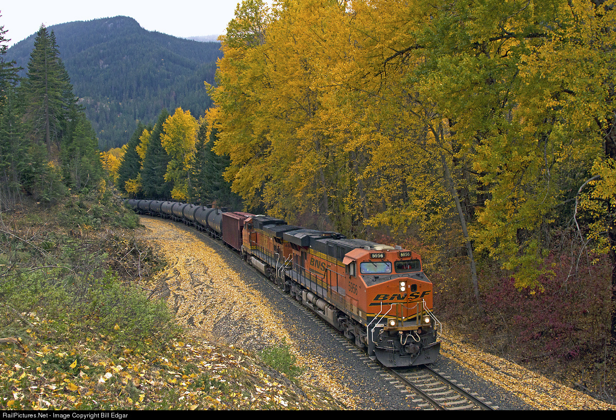 | The fall rains are about to start on Stevens Pass as an empty oil train rolls east into Merritt, WA in a blanket of golden leaves. The orange locos are perfect for fall photos just a week ahead of Halloween. |
