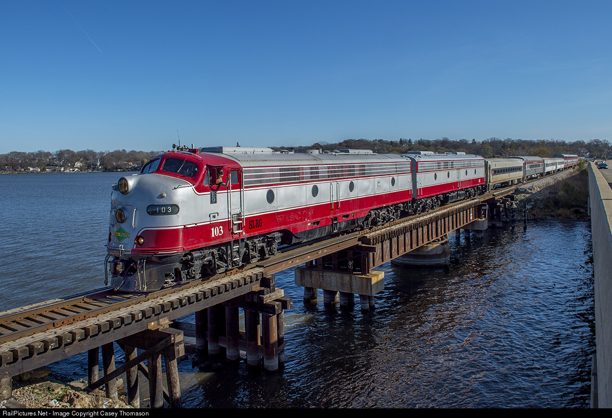 SLRG 103 leads a B-unit, 9 cars, and another A-unit through Fox Lake, Illinois, on their way towards Middleton, Wisconsin, along the Wisconsin & Southern mainline.