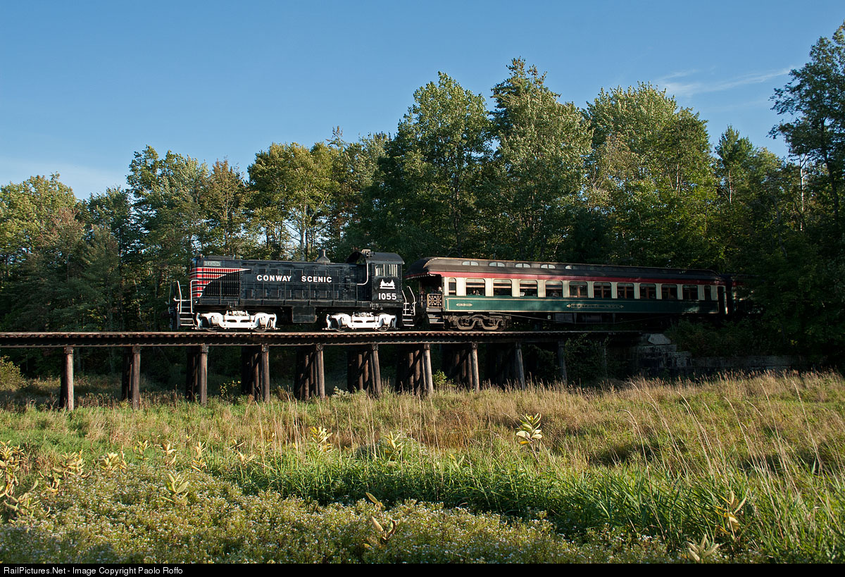 Now-departed S4 #1055 leads train 31 north past one of my favorite photo spots, Moat Brook Trestle. Since the photo was taken, #1055 has been sold to the Downeast Scenic Railroad, and is running for them in Maine.