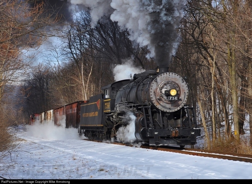 Since 1988, a 16 mile long segment of the old Western Maryland mainline has been used as a tourist railroad, known as the Western Maryland Scenic Railroad. In this scene, a re-created "extra" freight train, powered by locomotive 734, thunders up the mountain heading west in the harsh winter afternoon sunlight. At the end of the 2015 season, number 734 will be taken out of service for an undetermined amount of time.