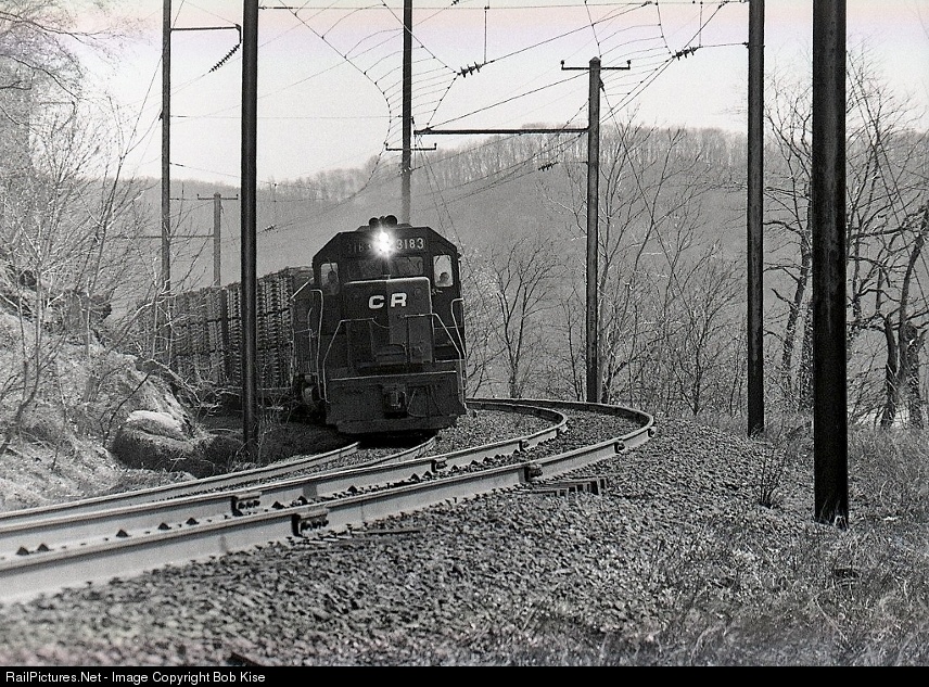 The CR 3183 West rounds the big curve near the Turkey Hill watchbox, on its way to Enola or Harrisburg, in a photo recorded on TRI-X pan film. The Enola Branch, or Atglen & Susquehanna Branch, was known for its sharp curves and intermediate cat poles, giving it an interurban railway-like milieu. The 3183 was built by EMD for the Penn Central in October, 1968. Today, you can hike or bike under the cat poles here; see accompanying map for the location of the entrance to the public parking area at 2459 River Road.