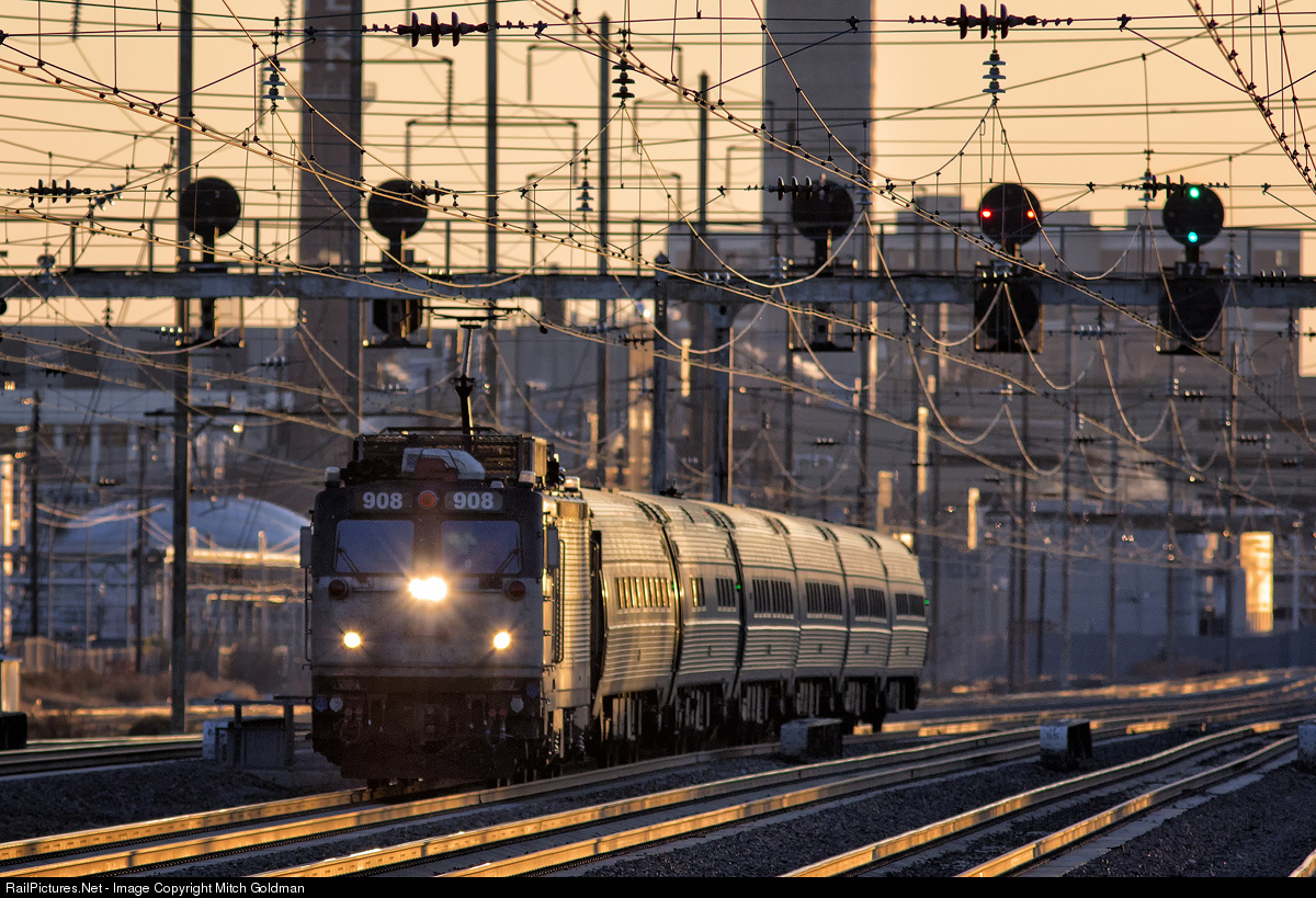Amtrak AEM-7 #908 soldiers through another day captured here in Linden, NJ at last light ducking a signal bridge while en route to Newark, NJ and points north.