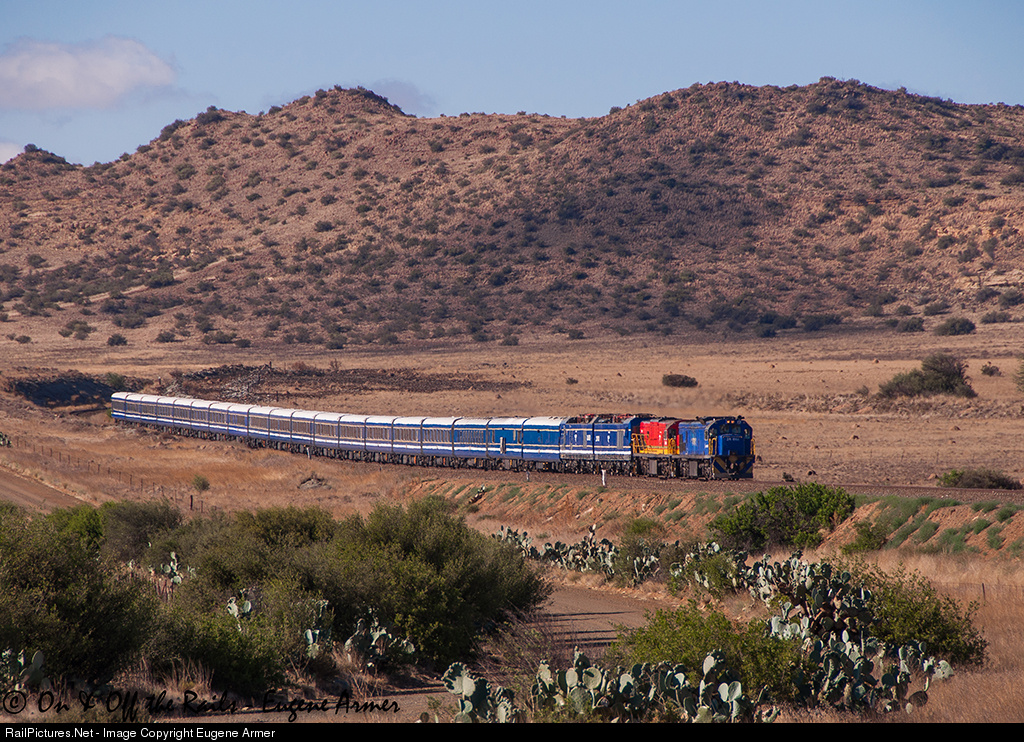 A week long closure of the Cape main line between De Aar and Kimberley resulted in the luxury Blue Train (as well as Rovos Rail and the Premier Classe) being rerouted via Noupoort and Bloemfontein on their journeys between Cape Town and Johannesburg. This provided a very rare opportunity to photograph the Blue Train behind diesels in the southern Free State, where the northbound 19-car train is seen in early morning light just south of Springfontein, near Besembos siding. Tucked in behind the pair of class 34 diesels are the two Chinese dual-voltage class 20E electric locomotives allocated to this train, 20 031 and 20 032, being dead-hauled between De Aar and Bloemfontein. The diesels are 34-003, one of the first three 34's imported in 1971 from GE in the USA, and 34-914 from the 900 series, which does not have the saddle filter on the roof behind the cab.