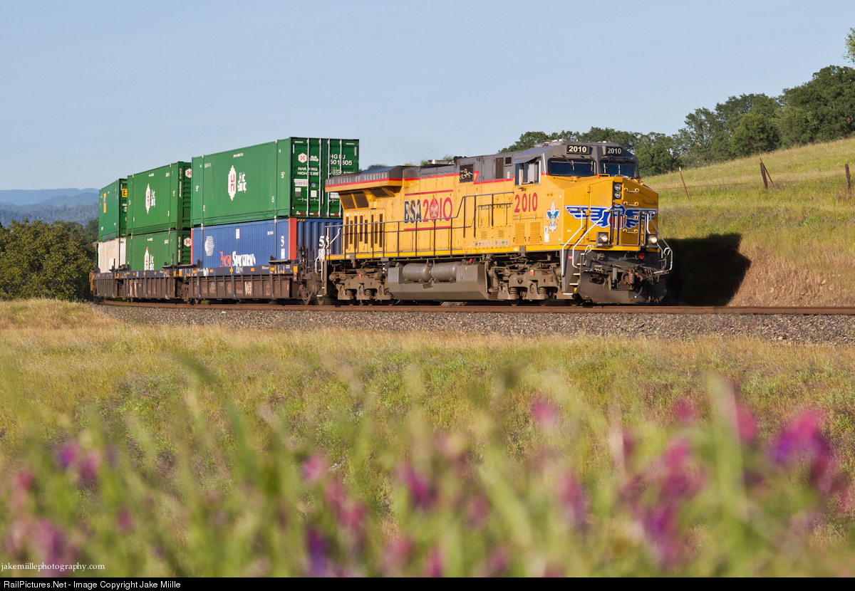 | As wildflowers begin to bloom, UP 2010 (Boy Scout Unit) leads a westbound stack train out of Oroville, California. |