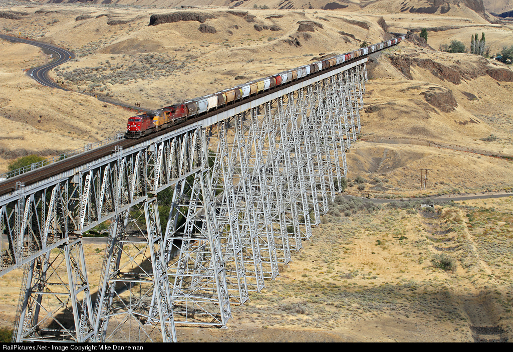 A westbound Union Pacific grain train led by Canadian Pacific AC4400CW No. 9620 crosses UP’s massive bridge over the Snake River at Joso, Washington, on September 21, 2015.