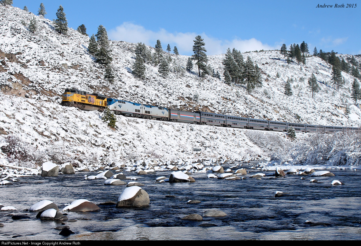 | Running approximately 4 hours behind the mark, Amtrak's Zephyr 5 heads west along the Truckee River with a broken down P42 and a UP ACe in the lead. |