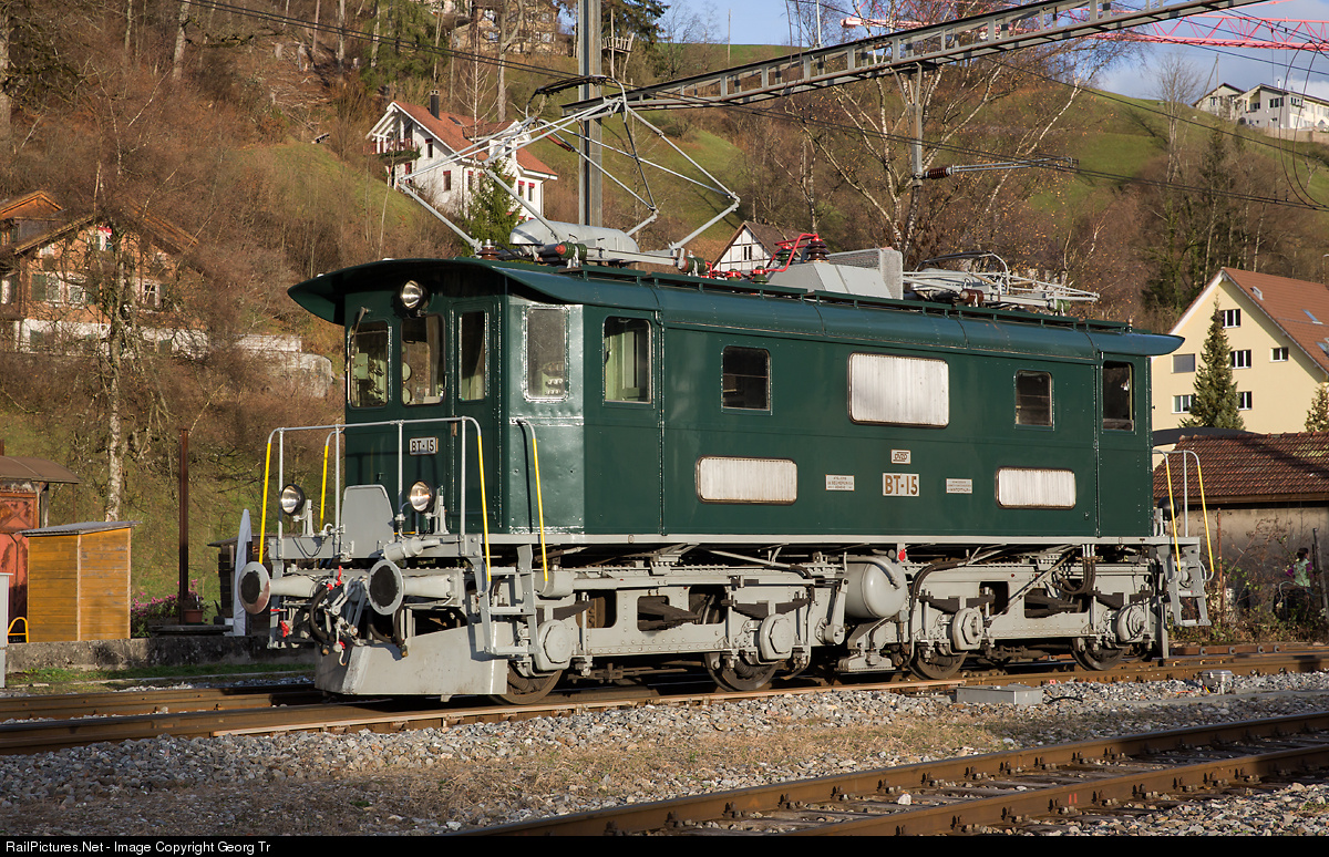 Former Bodensee-Toggenburg-Bahn locomotive Be 4/4 # 15, now running for the Dampfbahnverein Zürcher Oberland /Steamtrain association Zürcher Oberland (DVZO), in Bauma. The recently refurbished locomotive was built in 1932 by SLM and SAAS and has 1199 kW, max. velocity is 80 km/h.