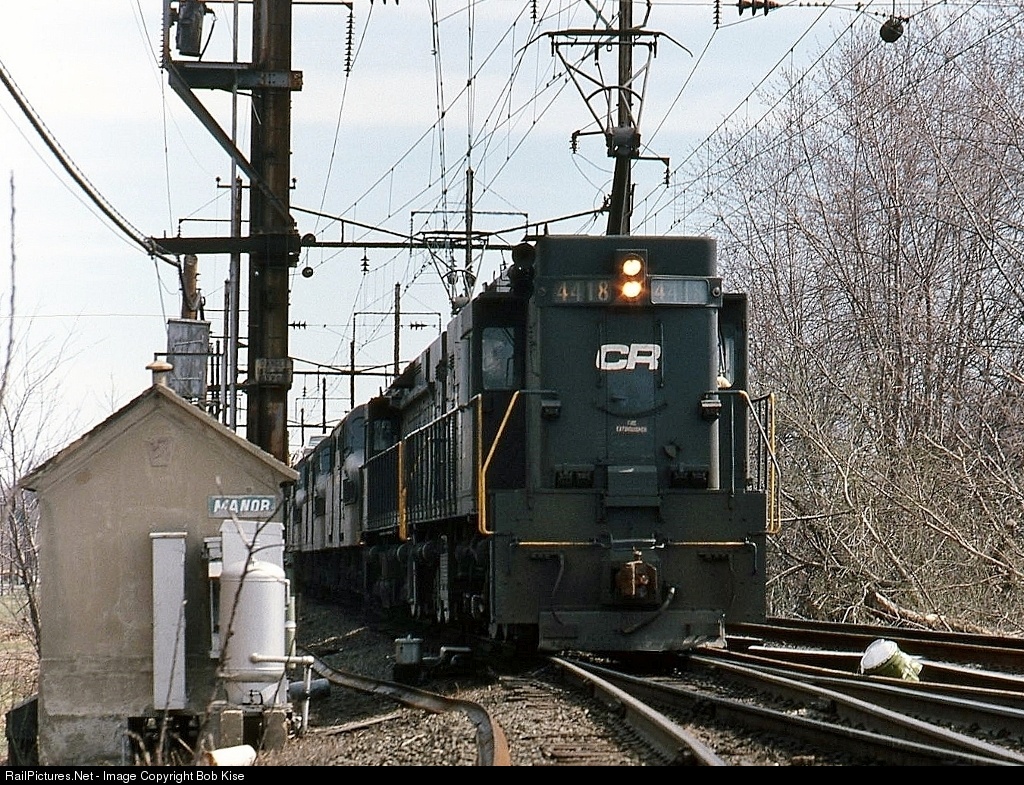 Two E44s have three GG1s dead-in-tow at the head of a westbound manifest at the east end of Manor Siding. This photo shows typical infrastructure found at a Pennsy-PC-early CR control point; a concrete relay box (with a CP "MANOR" metal sign in PC font,) a compressed-air tank, and air piping to a track switch. Trains used Manor Siding as a means to pull off the main westbound track, to change crews, etc. The siding is long-gone, no longer needed because of the decreased traffic on this line.