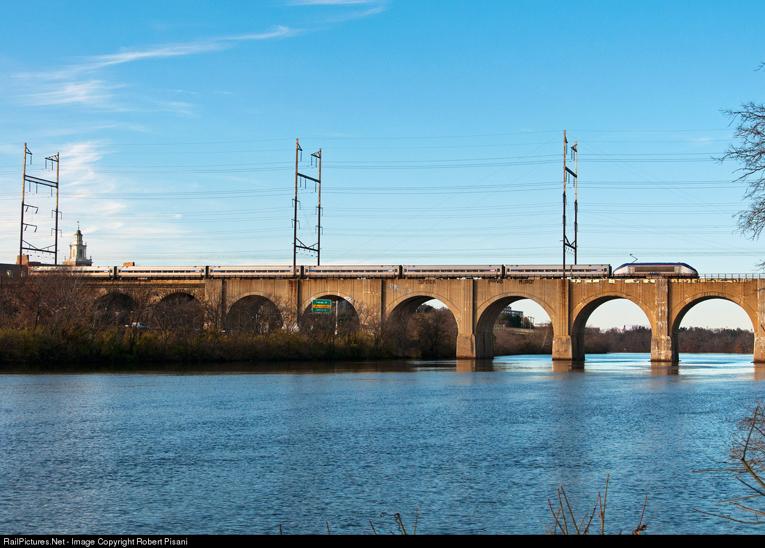 | Amtrak typically borrows two sets of equipment from both NJ Transit and MARC to handle the increased traffic load on the Northeast Corridor the Sunday after Thanksgiving. The first of two eastbounds from Washington, DC to New York to use a MARC consist glides across the Raritan River between New Brunswick and Highland Park, NJ. |