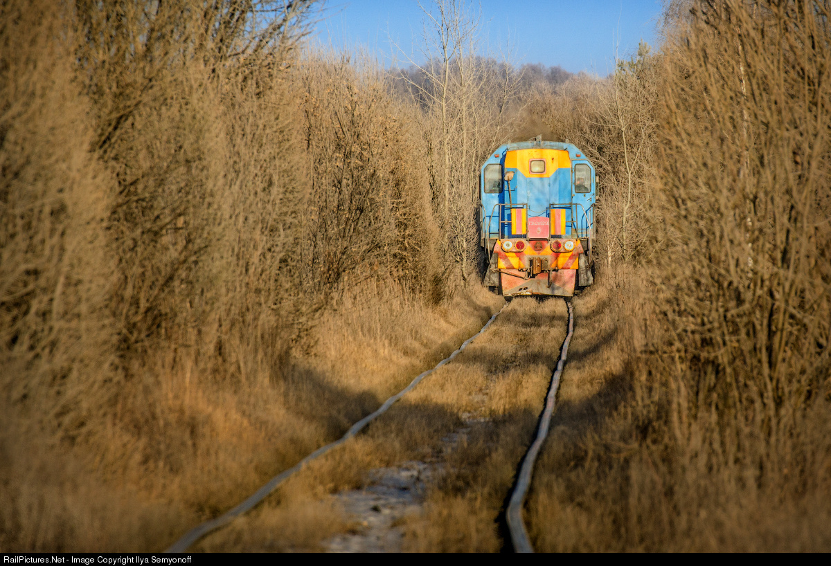 TEM2U locomotive moves along the railroad from the clay pit to the plant "EUROCEMENT group" factory for the production of building materials. The EUROCEMENT group is one of the biggest supplier of cement, ready-mix concrete and aggregates in Europe and the biggest in Russia.