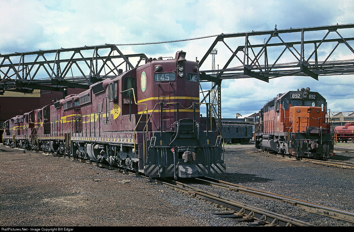 DMIR 145 heads up a quartet of SD9s at DMIR's Proctor diesel shops while Bessemer & Lake Erie SD38-2 892, affectionately known as "the Pumpkin" looks on. The 892 would later become DMIR 215.