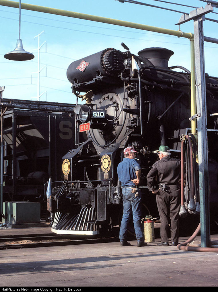 | Southern Railway Master Mechanic-Steam Engines Bill Purdie Jr. and a fellow crew member inspect T&P610 prior to a pair of weekend excursions out of Alexandria, VA |