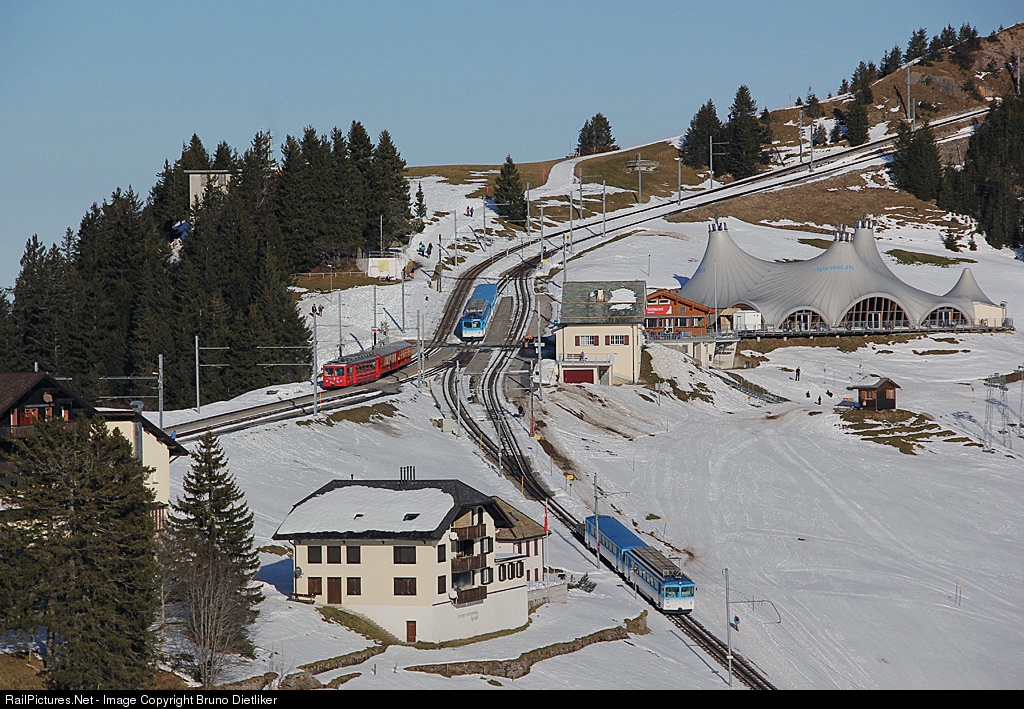 | Rush hour at Rigi Staffel (1604m asl): Left red cogwheel train from Vitznau uphill toward Rigi Kulm, right blue cogwheel train from Goldau uphill toward Rigi Kulm. The train in the middle waits for the next trip |