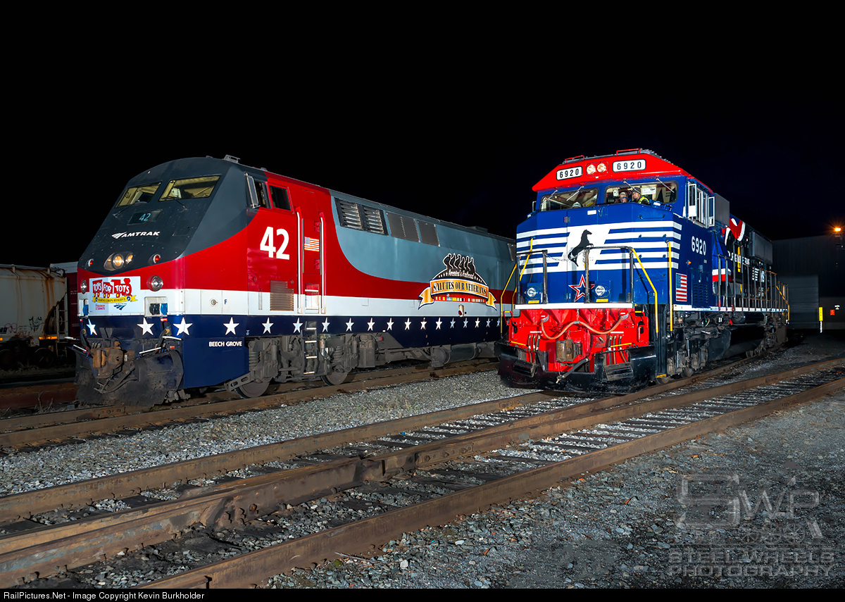| The night before the 17th Annual US Marine Corps. Toys for Tots train in New York, Norfolk Southern's SD60E - Honoring Our Veterans - awaits the positioning of the Amtrak equipment for the consist building for Saturday's train. Amtrak Saluting Our Veterans locomotive - P42 #42 - is seen along side the freshly touched up and sparkly NS #6920 at the NS Binghamton Yard. |