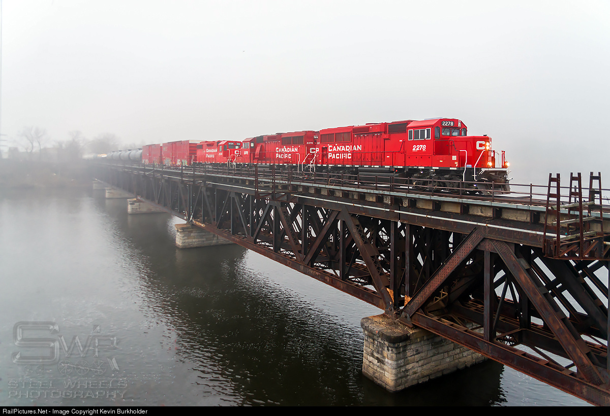 | Canadian Pacific Railway's Saratoga Springs-based local train D45 is seen heading back northbound from Albany, New York, with a pair of GP20C-ECO units - 2278 and 2276 - leading CP GP38-2 3174 across the Mohawk River at Cohoes, New York in ice fog. |