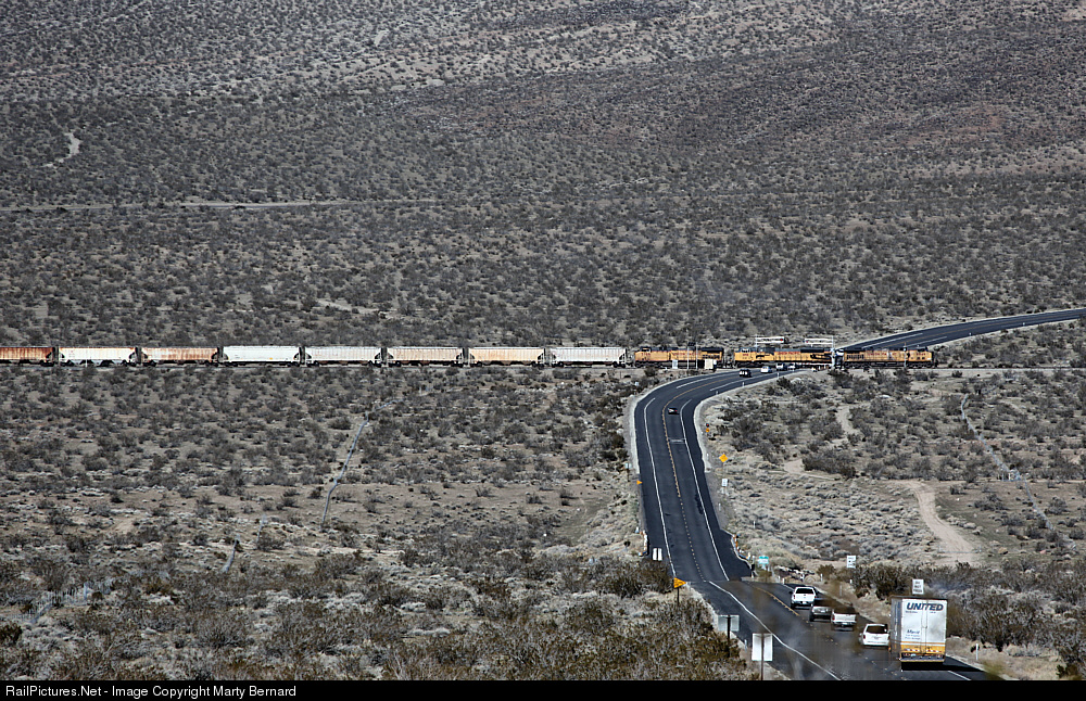 | On the Jawbone Branch in the Mojave Desert. I counted 98 cars: 3 tank cars and 95 covered hoppers. The potash hoppers would be empty in this direction. Searles, a few miles ahead, is the end of the Jawbone Branch and the interchange point with the Trona Railway which runs to the mineral-rich area around the town of Trona, CA. |