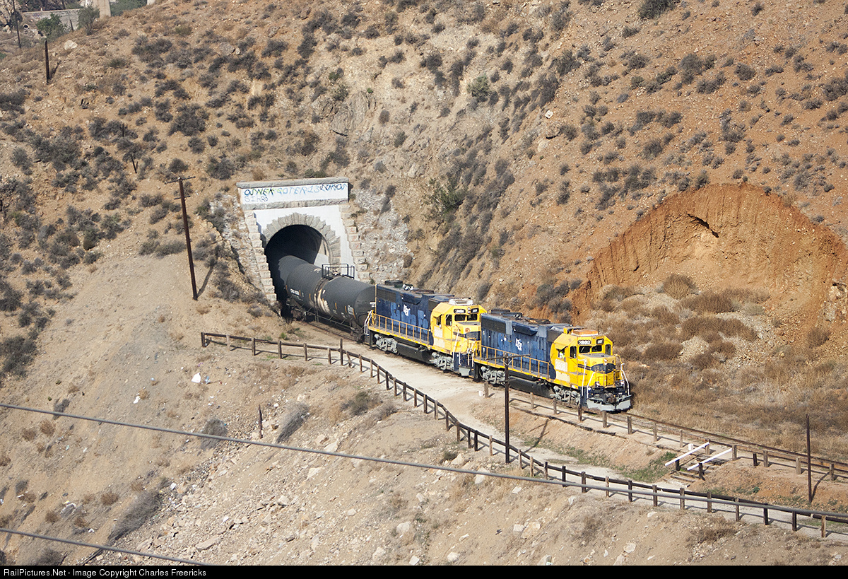 The Baja California Railroad road job pulls out of Tunnel One with a string of tank cars. The platform there is for the six times a year (or so) tourist train that this RR also runs from Tijuana to Tecate.