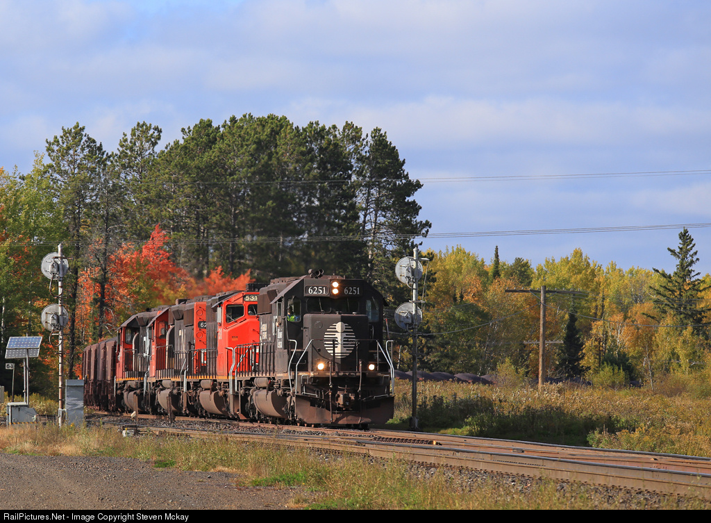 | IC 6251 leads 3 other SD40's through Iron Junction and will make the turn and head for Biwabik. Once arriving into Biwabik they will wait for several hours on MOW to clear and also wait for a northbound empty train to pass them before continuing to Two Harbors. |