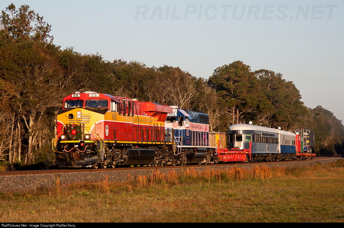 FEC #818 & #425 lead the Toys for Tots train south out of Jasksonville, FL as it passes through St Augustine in the early morning sun.