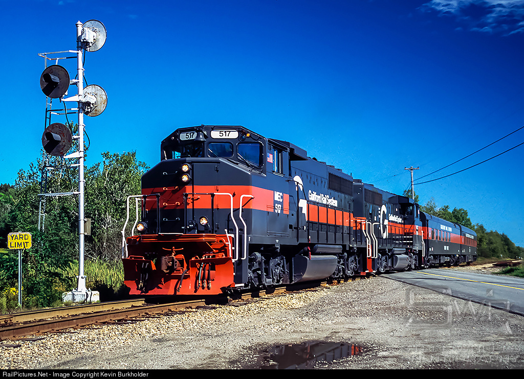 On September 2004, Guilford Rail System operated a Governor Baldacci "Jobs Express" train, which is seen passing the GRS District 1 CPF-66 signals in Hermon, ME.