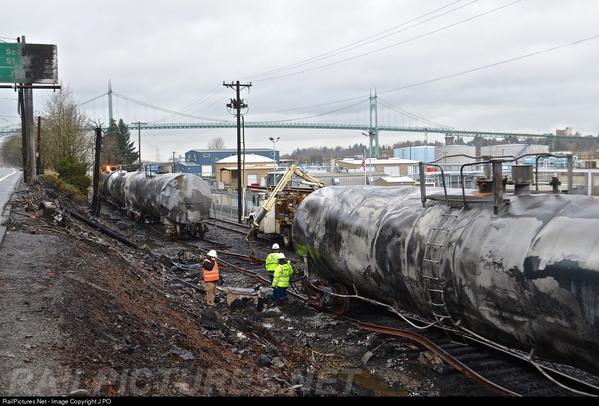 P&W 2307 backs a couple cars away from the impact zone the following day after a semi truck slammed into a cut of cars in north west Portland. Sadly, the driver lost his life but fortunately the contents of the car did not explode. The tank car on the left side of the shot about a 3 inch tear on the upper left side at the end. Notice the charred Highway 30 sign.