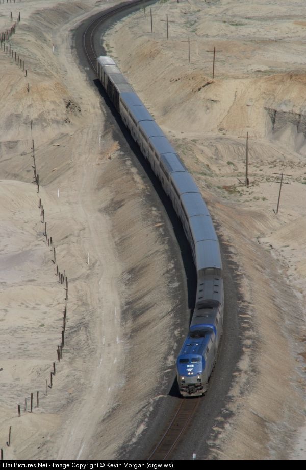 | It is 9:30am and Amtrak 6 is running about 45 minutes late. This picture was taken from atop one of the many dirt mounds that can be found in the desert. This particular mound is about halfway between the sidings of Floy and Solitude. |