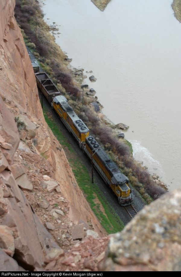 Ruby Canyon does not see too many trains anymore, with Union Pacific diverting the majority of traffic through Wyoming. On this day, however, a westbound rail train led by a UP SD60 an a UP SD70M is approaching the west end of the canyon.