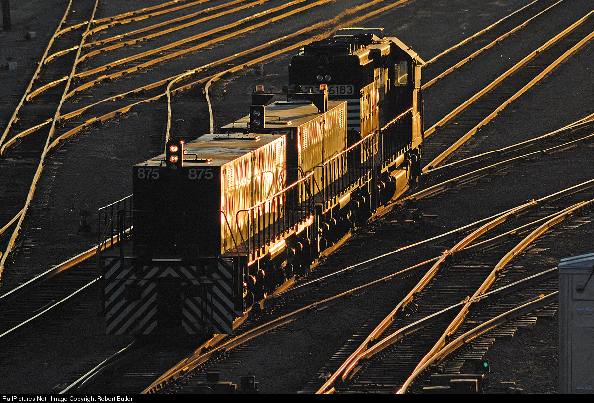 The first rays of sunrise catch NS 6183 along with yard slug 875 and friend rolling out into the Bellevue yard to start the days work.