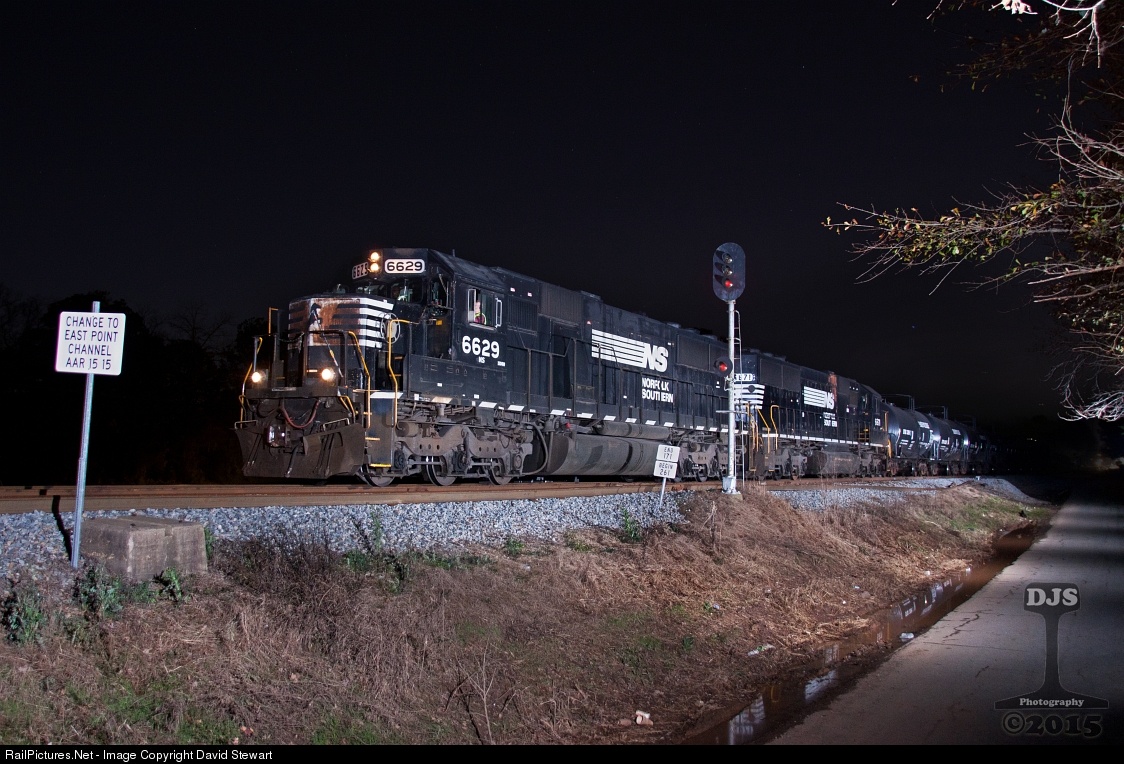 | Just thirty minutes after pulling onto the mainline at Forest Park Yard, East Point to Macon manifest 139 starts it's southbound journey with a pair of well used NS SD60s. NS 6629 leads the train by the OS point of Lee shortly before midnight. |