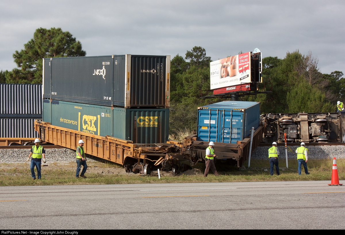 FEC crews look over the damage after FEC train 226 north derailed coming out of the north end of the Pineda siding. FEC 433 is on its side, while FEC 419 remained on the rails. 5 double stack well cars derailed but remained upright.