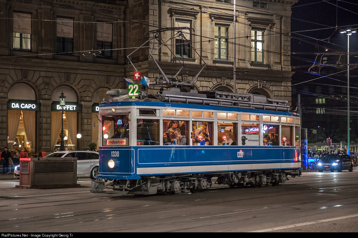 Street car Be 4/4 # 1330, built as Ce 4/4 # 330 in 1931, called "Elephant", of the Verkehrsbetriebe Zürich (VBZ). It is used as party tram (street car for party), here used as "Fonduetram". On board you can eat a famous swiss Fondue, a hot cheese speciality. The street car is just passing in front of Zürich main station building and will enter the Bahnhofstrasse shortly.