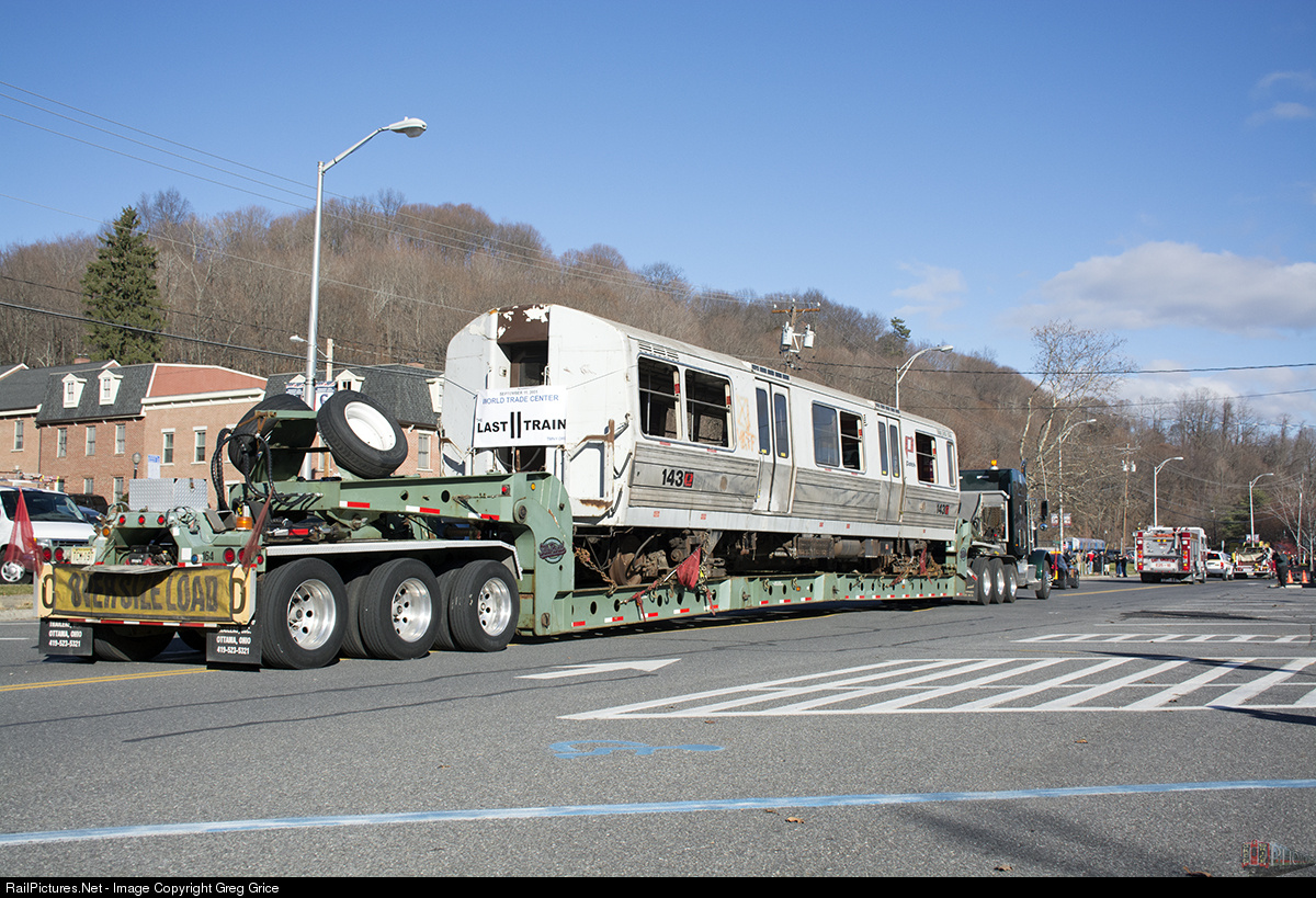 PATH #143 , a Hawker-Siddeley PA-3, was parked in the PATH station under the World Trade Center on the morning of Sept. 11, 2001. On Feb. 22, 2002, the subway car was pulled from a cast-iron tunnel by cable and lifted by crane onto a truck. It was taken to Hangar 17 at Kennedy International Airport, where other surviving items were stored. On the night of December 15th, 2015 the railcar was trucked by Silk Road Transport from JFK to the New Jersey side of the George Washington Bridge. The following morning the rest of the journey to Kingston Trolley Museum was completed, ending with a ceremony. This video displays most of the journey. PATH 143 is now currently in the process of being restored to display condition.
