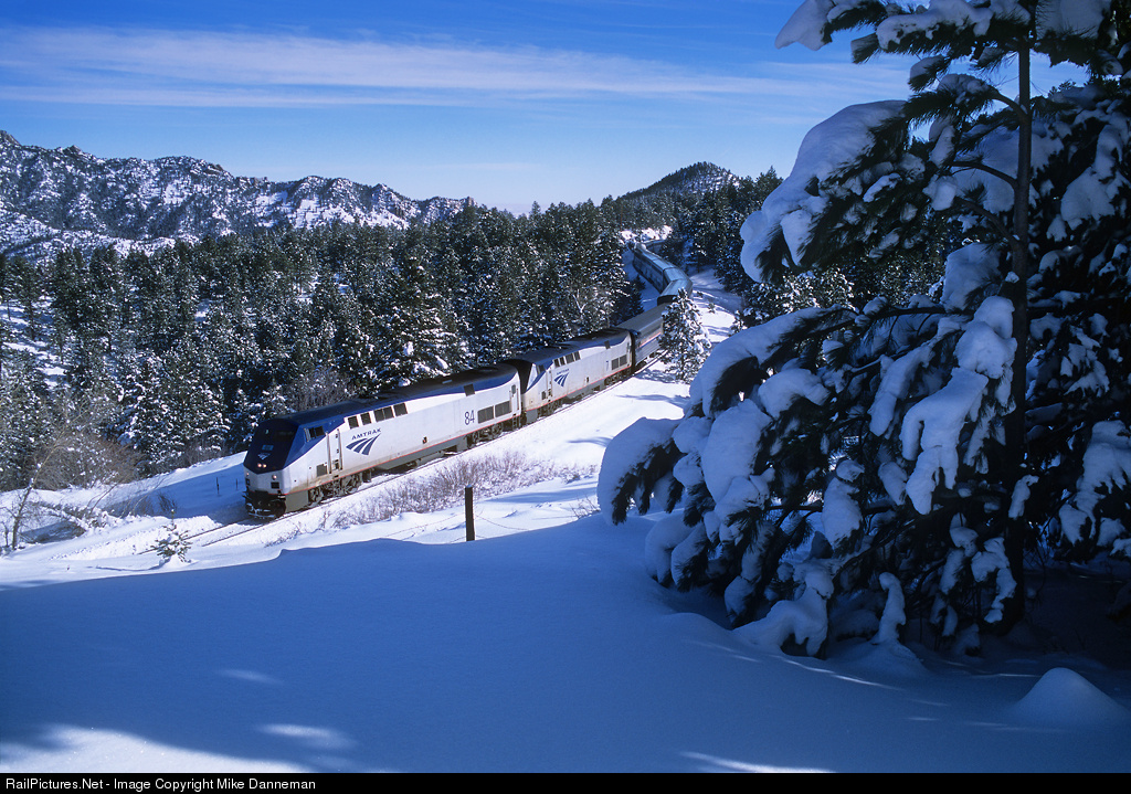 | Amtrak’s westbound California Zephyr cruises through the snow at Crescent, Colorado, on December 22, 2006. |