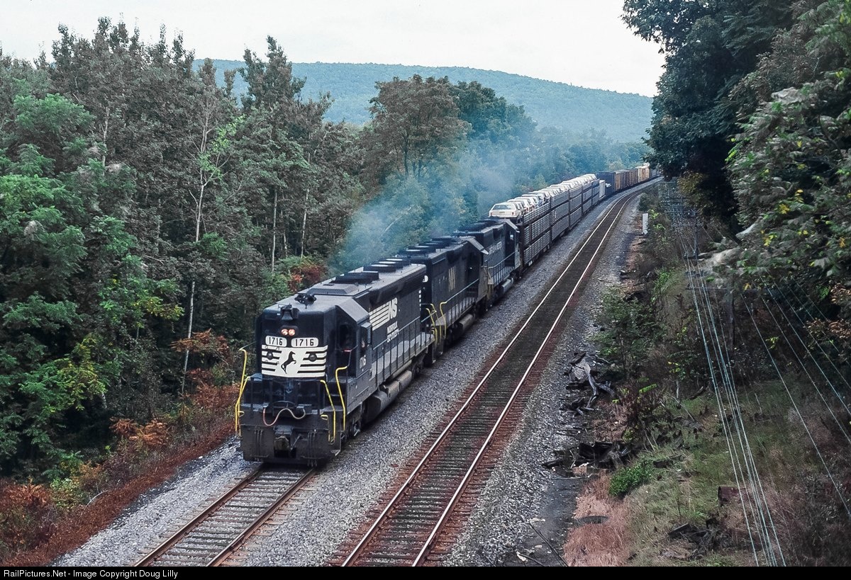 Although it looks like Virginia, this is an eastbound D&H train rolling through Lowman, New York. Three NS/N&W EMD’s are pouring it on as they head to Binghamton.