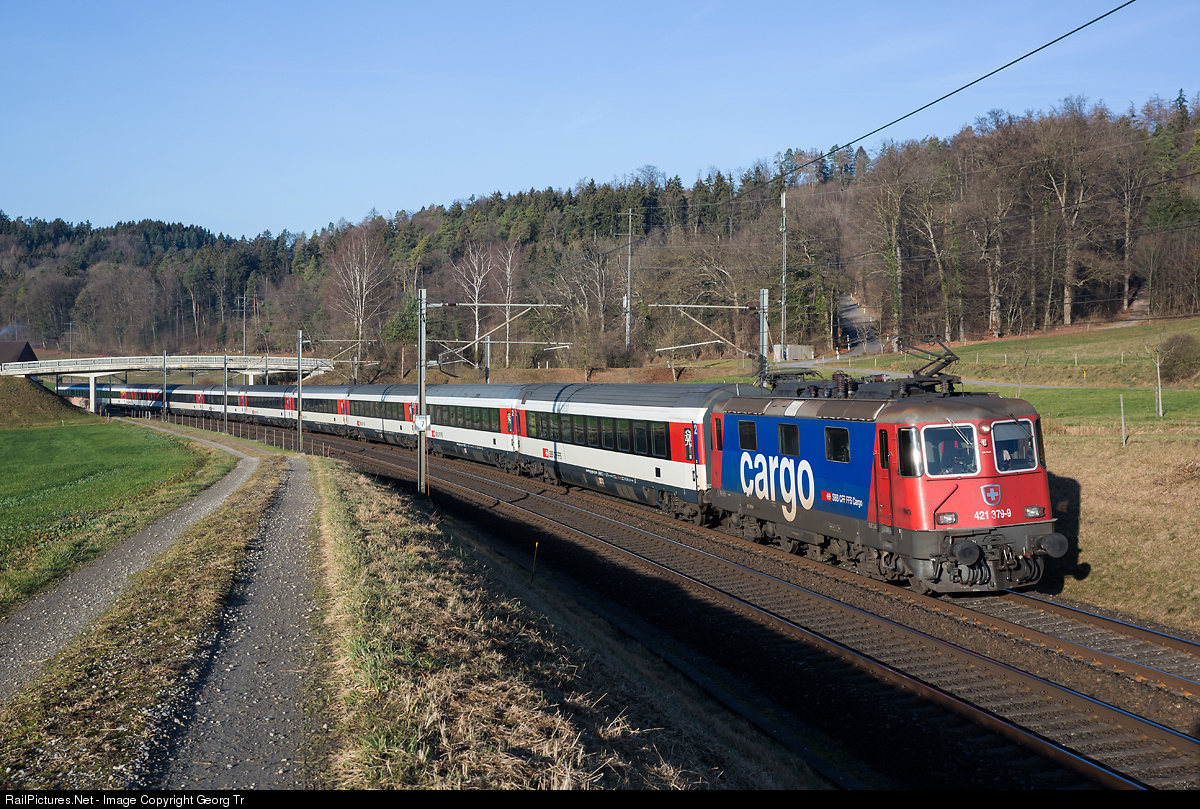 | Re 421 # 379 of SBB Cargo is pulling Eurocity 193 Basel-Zürich-Lindau-München between Zürich HB and Lindau. The train is between Schottikon and Elgg on the line Winterthur-St.Gallen. |
