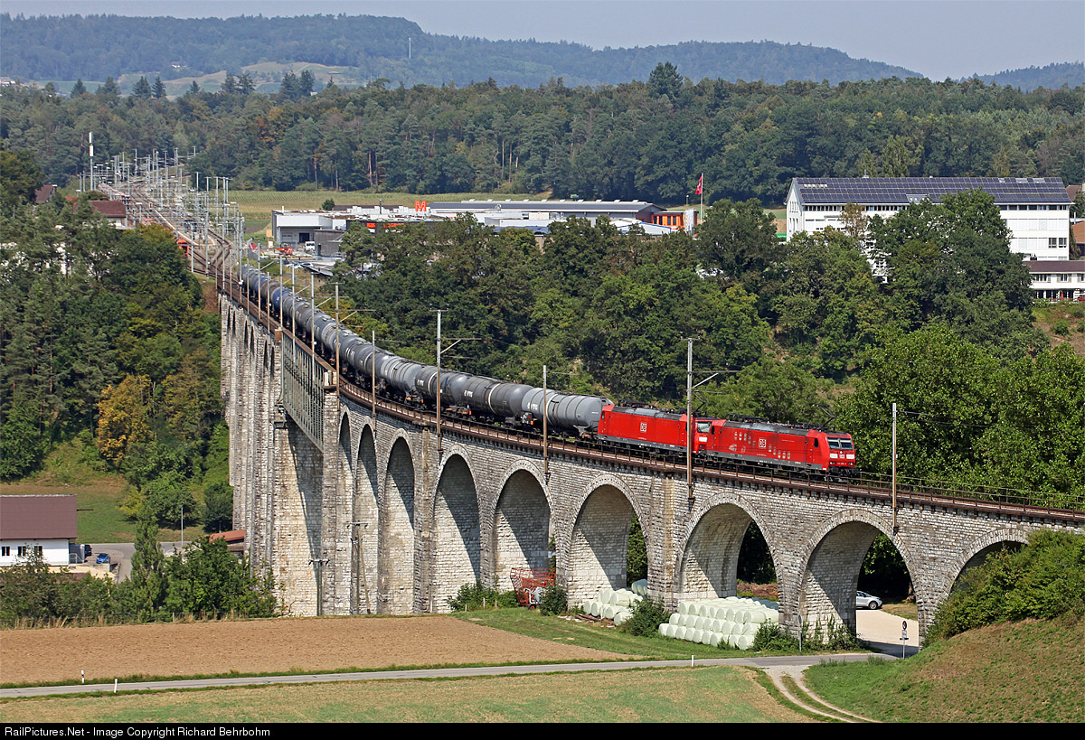 | Two 185, 185 090 with with publicity paint scheme for Bombardier Transportation in Kassel, are pulling a freight train with avgas from (Germany-) Schaffhausen to Glattbrugg. |