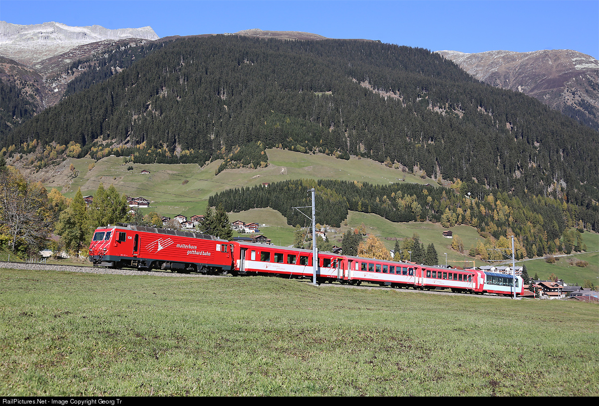 | The cogwheel locomotive HGe 4/4 II # 108 of the Matterhorn Gotthard Bahn (MGB) with Regio train 839 from Disentis to Andermatt near Acla da Funtauna. In the rear a Glacier Express panorama car, surplus in this time of the year. |