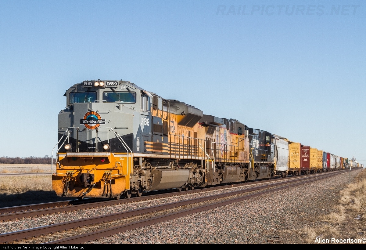 | UP 1989, 5986, & NS 9883 lead a westbound manifest on UP's Kearney sub. |