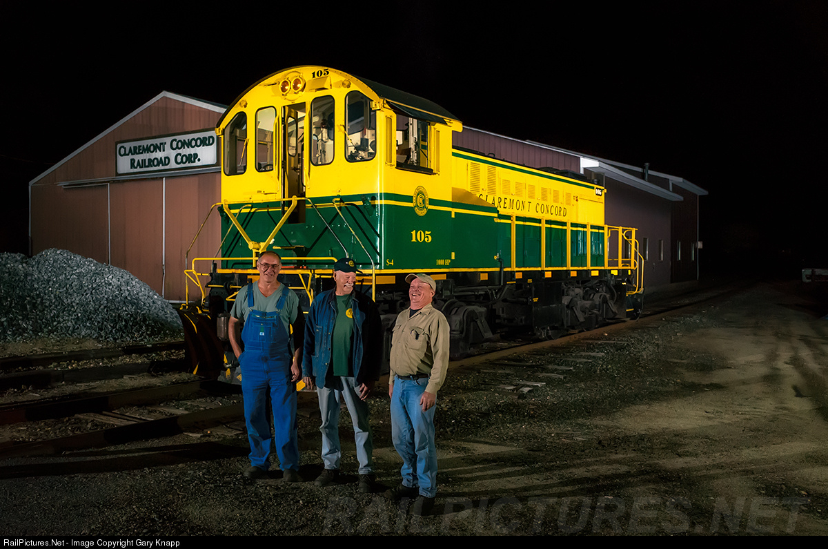 Former and present employees of the Claremont Concord Railroad share a joke posing for photographers during the night photo session honoring the New England shortlines sale to Genesee & Wyomings New England Central. Left to right are Leo Landry, Dick Gassett and Wilder Moffit as the gleaming 105 looks on, her working days numbered now.