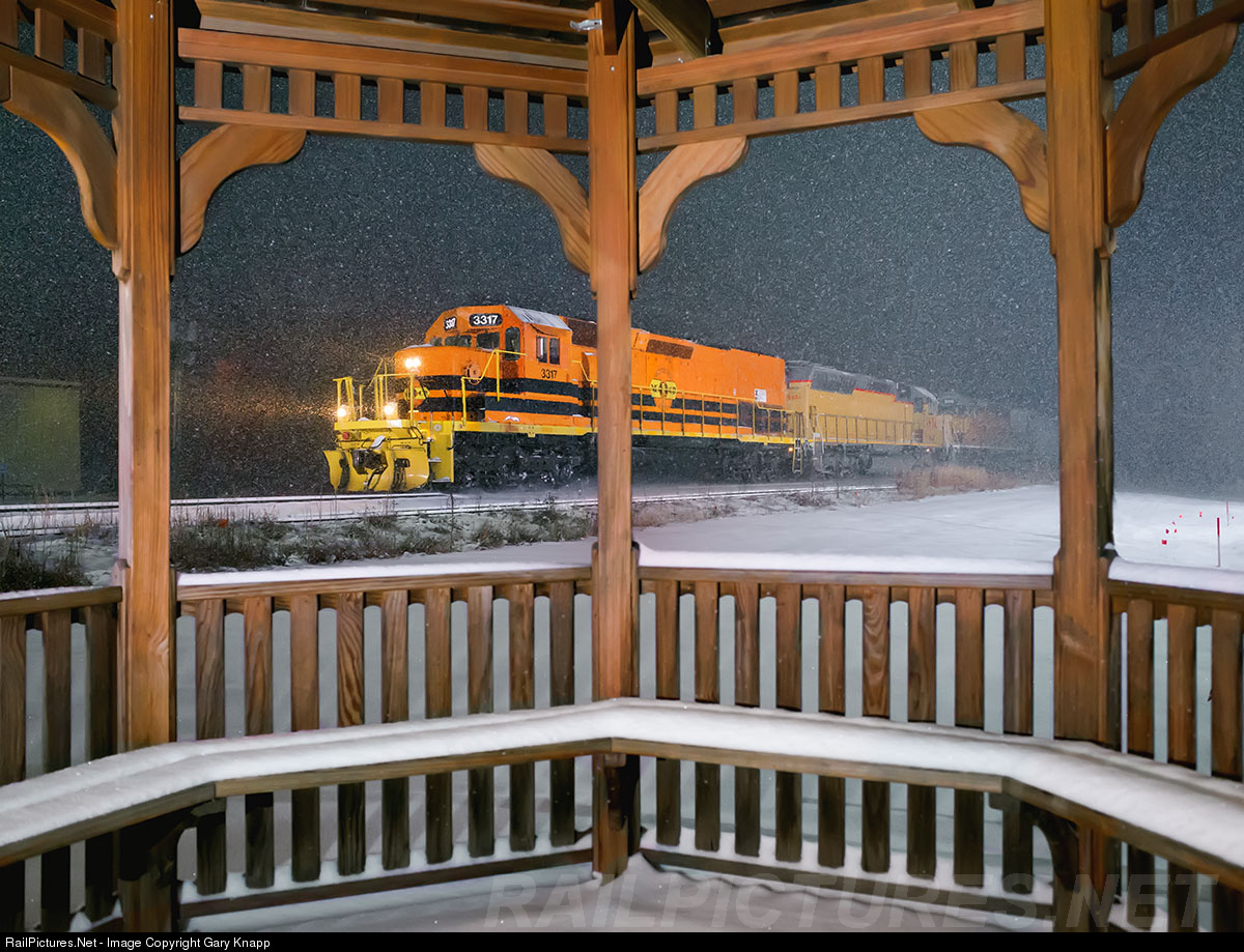 Tunnel Motor 3317 leads NECR 323 into Waterbury, VT. in the middle of the seasons first real snowstorm on Dec. 29th at 04:25. Is there a better place to be shooting from in a snowstorm than inside a gazebo?