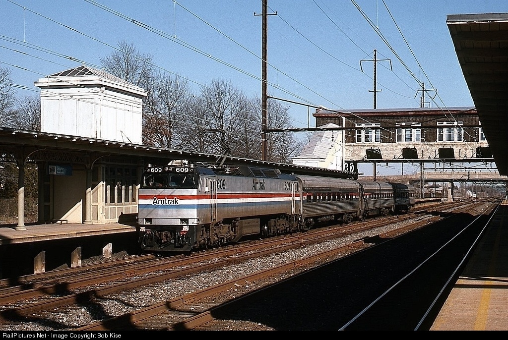 Early 1990s Keystone Line action, with a rebuilt E60 and three "Heritage" coaches, westbound to Harrisburg. No. 609 was built by GE for Amtrak in November, 1975 as the 957.