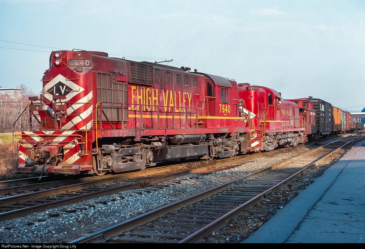 Conrail in Cornell Red – Almost eight months after the northeastern railroad scene has undergone its most dramatic transformation, many of the local activities continue on as usual. Here Lehigh Valley RS11 7640 and “hammerhead” RS3 211 lead a Lehigh Valley caboose and a cut of cars westbound through South Bethlehem. The train, most likely the Florence Local, is diverging from the original LV main to cross the Lehigh River and head to Allentown yard. The 7640 was later rebuilt as Conrail MT4 slug 1023, while the 211 was re-engined with an EMD prime mover and survives, repainted as LV 211, at the Rochester & Genesee Valley Museum.