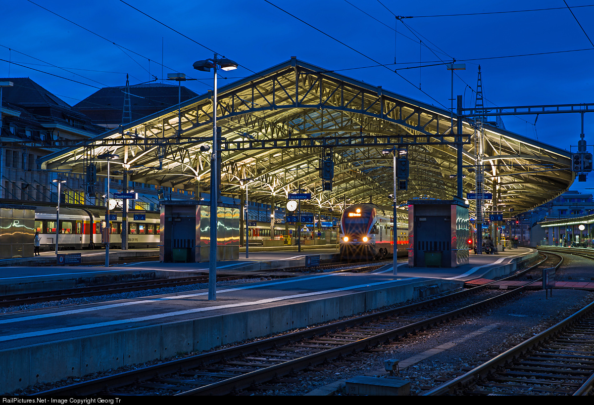 The Lausanne train station has one of the most beautiful platform halls, effectively illuminated in the blue hour. The construction of the hall, finished in march 1912, is a team work of Bosshard from Näfels, Buss AG from Basel and Schweizer from Albisrieden, Zürich. The single-bay hall with a dimension of 200 meter to 44 meter has a span of 30 meter over 6 tracks / 3 platforms and was renovated with new illumination in 2005.