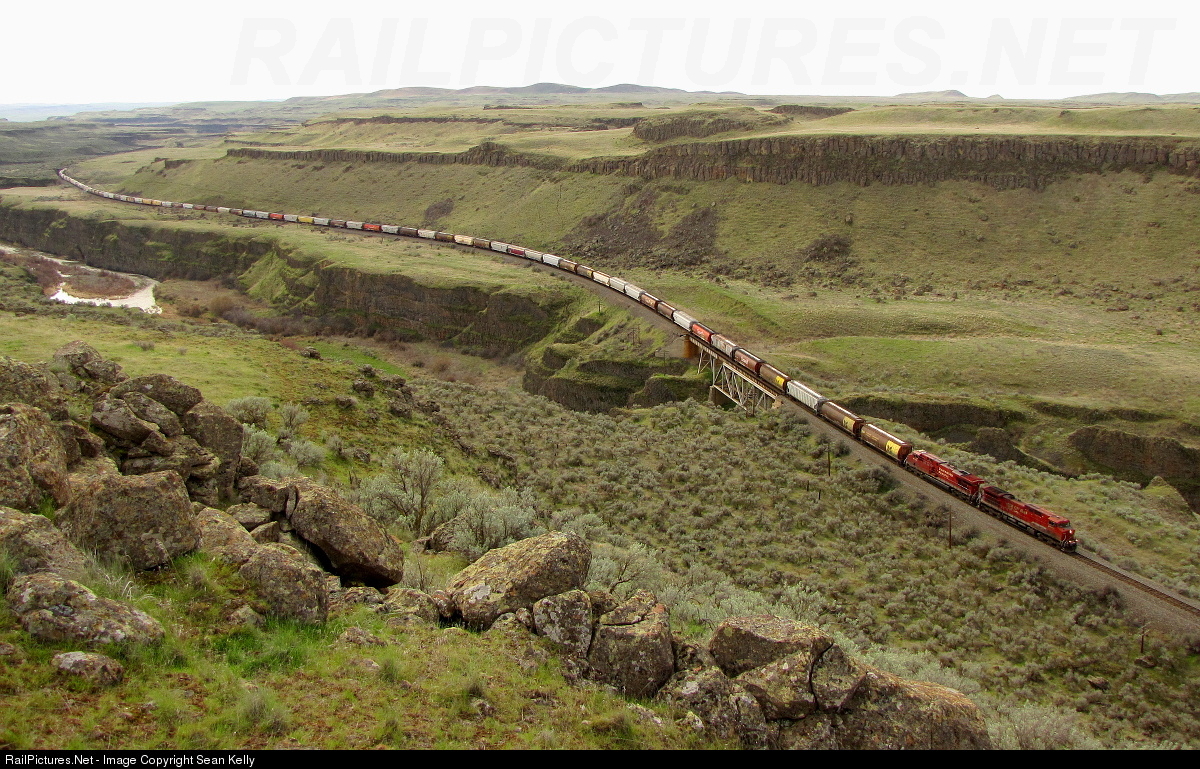 A northbound empty grain train with all CP power (two on the point and one DPU) heads up the Palouse River Canyon approaching the spur at Park amid springtime desert greens.