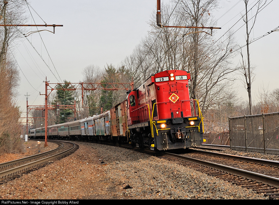M&E 18 hustles through MP 15.1 with the first half the Maine Eastern equipment returning from Maine. Today's consist included an ex Amtrak MHC, the Adirondack and Ethan Allen Baggages, a few lightweight passenger cars, a Comet I, and ME-5, Maine Eastern's one and only caboose.